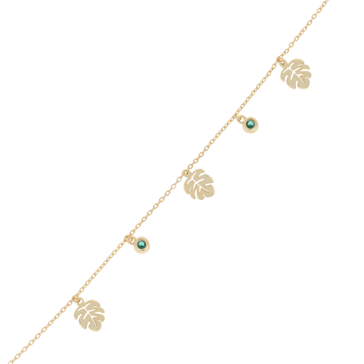 Bransoletka celebrytka pozłacana 925 listki monstery z zielonymi cyrkoniami