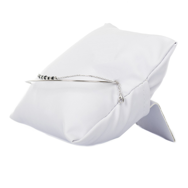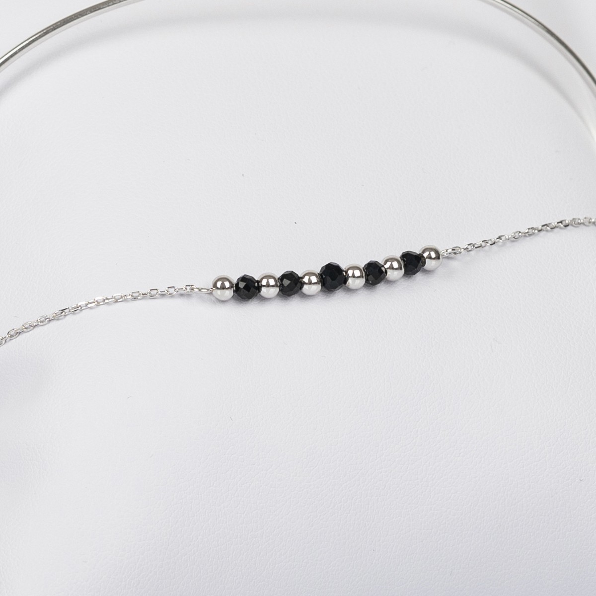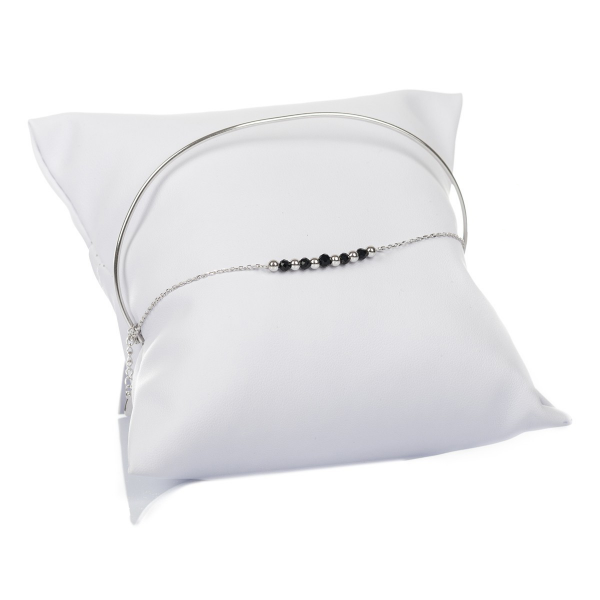 Niezwykle oryginalna bransoletka składająca się ze srebrnego koła orz łańcuszka z czarnymi i srebrnymi koralikami. Zestawienie dwóch zupełnie różnych w strukturze elementów czyni ją wyjątkową i daje bardzo ciekawy efekt. Idealnie pasuje do eleganckich kreacji, ale świetnie sprawdzi się również jako dodatek do nieco bardziej szalonych stylizacji, gdzie liczy się element zaskoczenia.