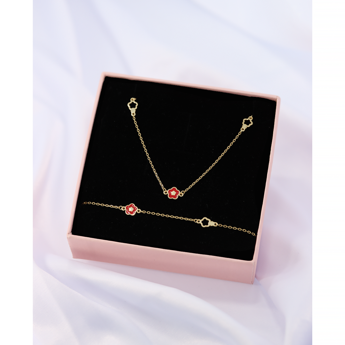 Komplet biżuterii pozłacanej 925 naszyjnik + bransoletka - z czerwonym kwiatkiem