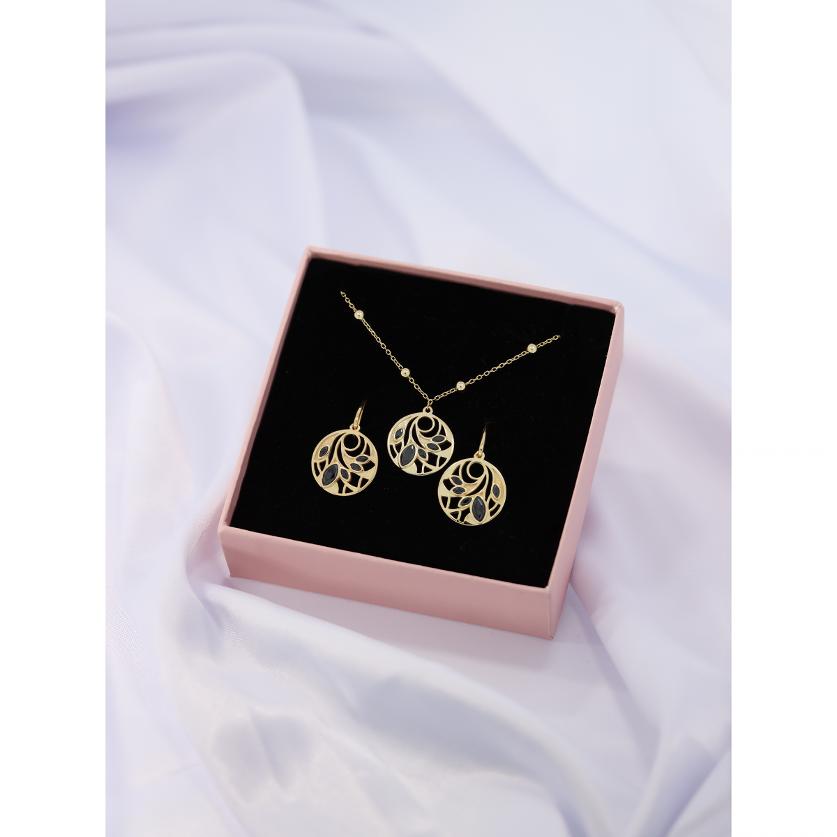 Zachwycający komplet pozłacanej biżuterii, który łączy subtelność natury z elegancją detalu. Naszyjnik z delikatną zawieszką w kształcie liści osadzoną w złoconym okręgu, uzupełniony lekkimi, wiszącymi kolczykami, tworzy spójną i kobiecą całość. Idealny do stylizacji, które mają mówić więcej niż słowa — od codziennego minimalizmu po wieczorną klasę.