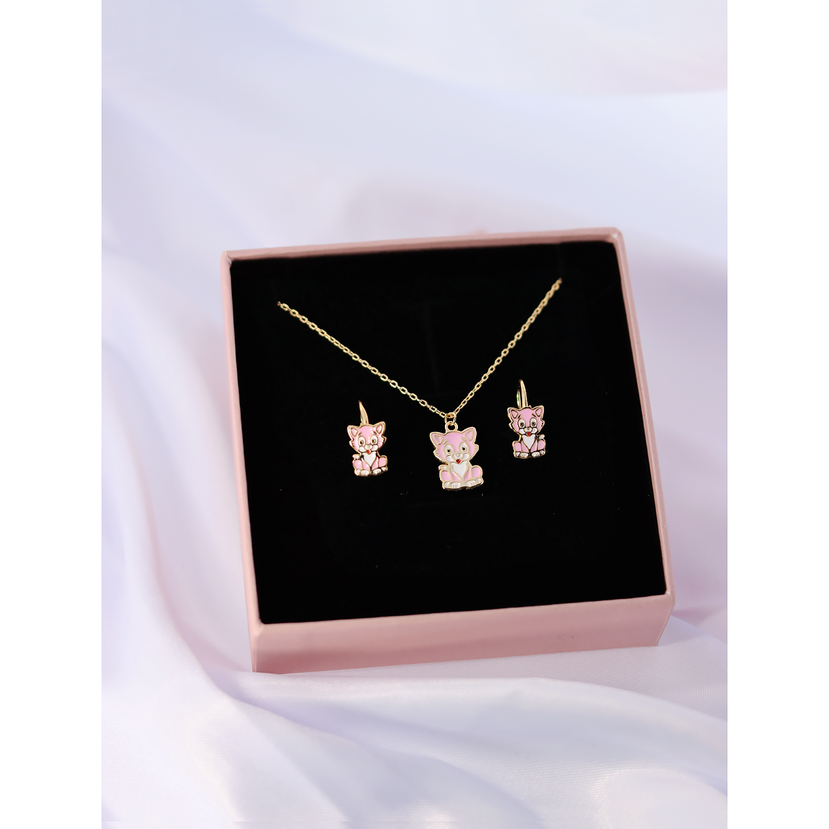 Komplet biżuterii pozłacanej 925 – naszyjnik + kolczyki - różowy kotek
