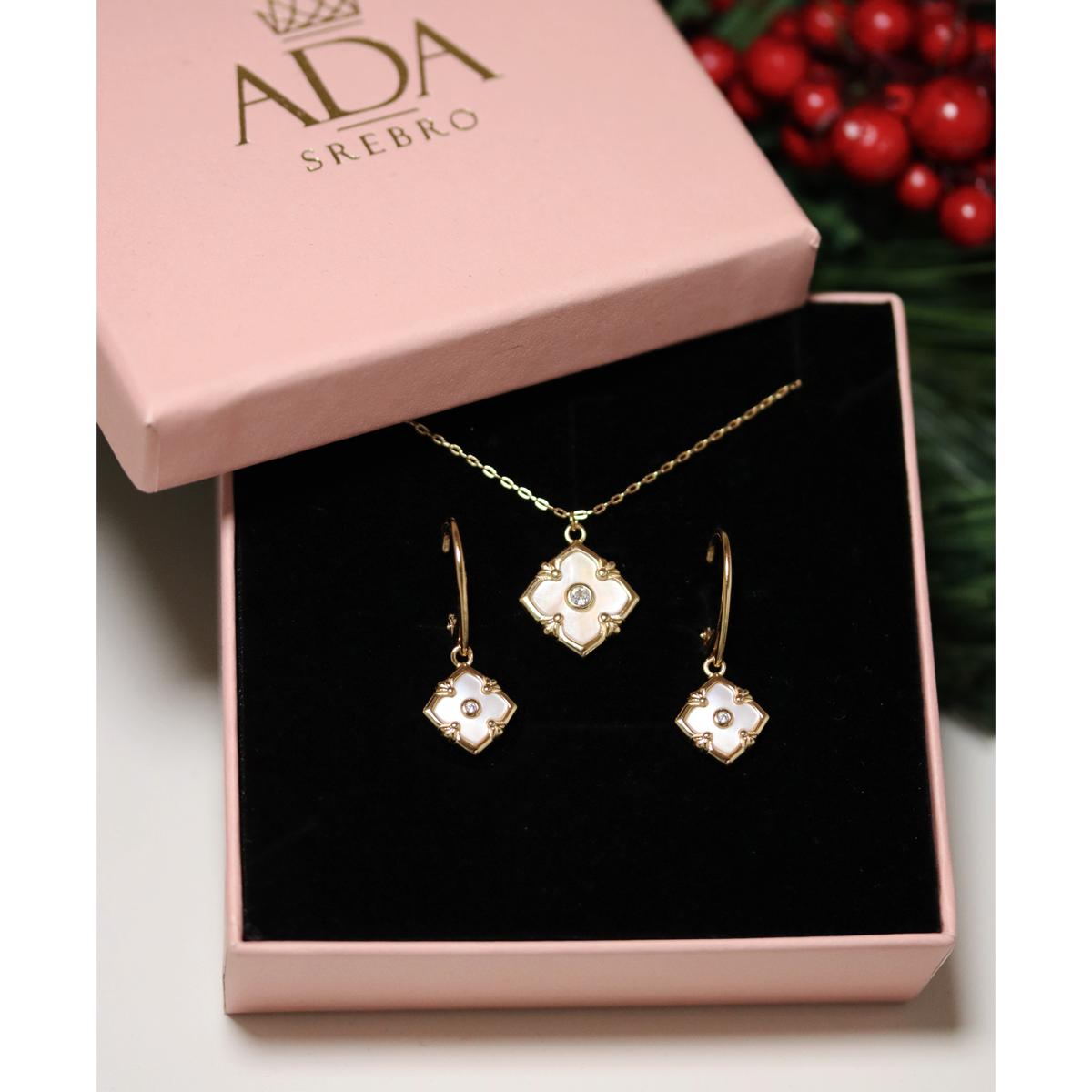 Komplet biżuterii pozłacanej 925 – naszyjnik + kolczyki z perłowym kwiatkiem koniczyną