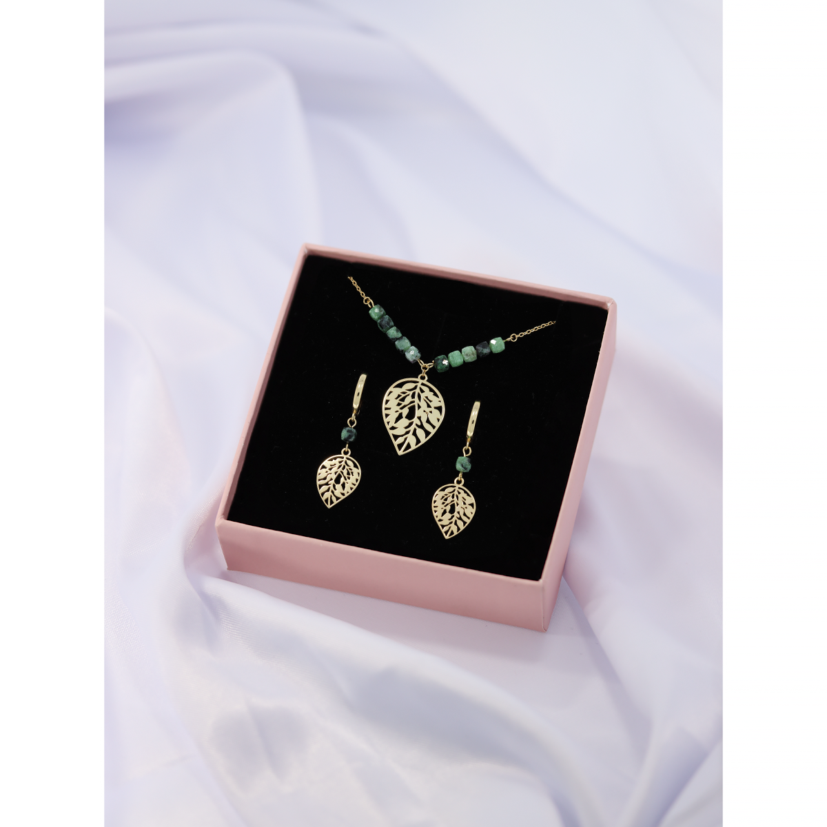 Ten wyjątkowy komplet łączy w sobie delikatność z botanicznym urokiem ażurowej zawieszki w kształcie liścia. Dodatkowe koraliki w odcieniach zieleni i różu nadają mu głębi i naturalnego charakteru. Komplet tworzy stylowy dodatek do codziennych stylizacji, ale równie pięknie prezentuje się przy bardziej eleganckich okazjach.