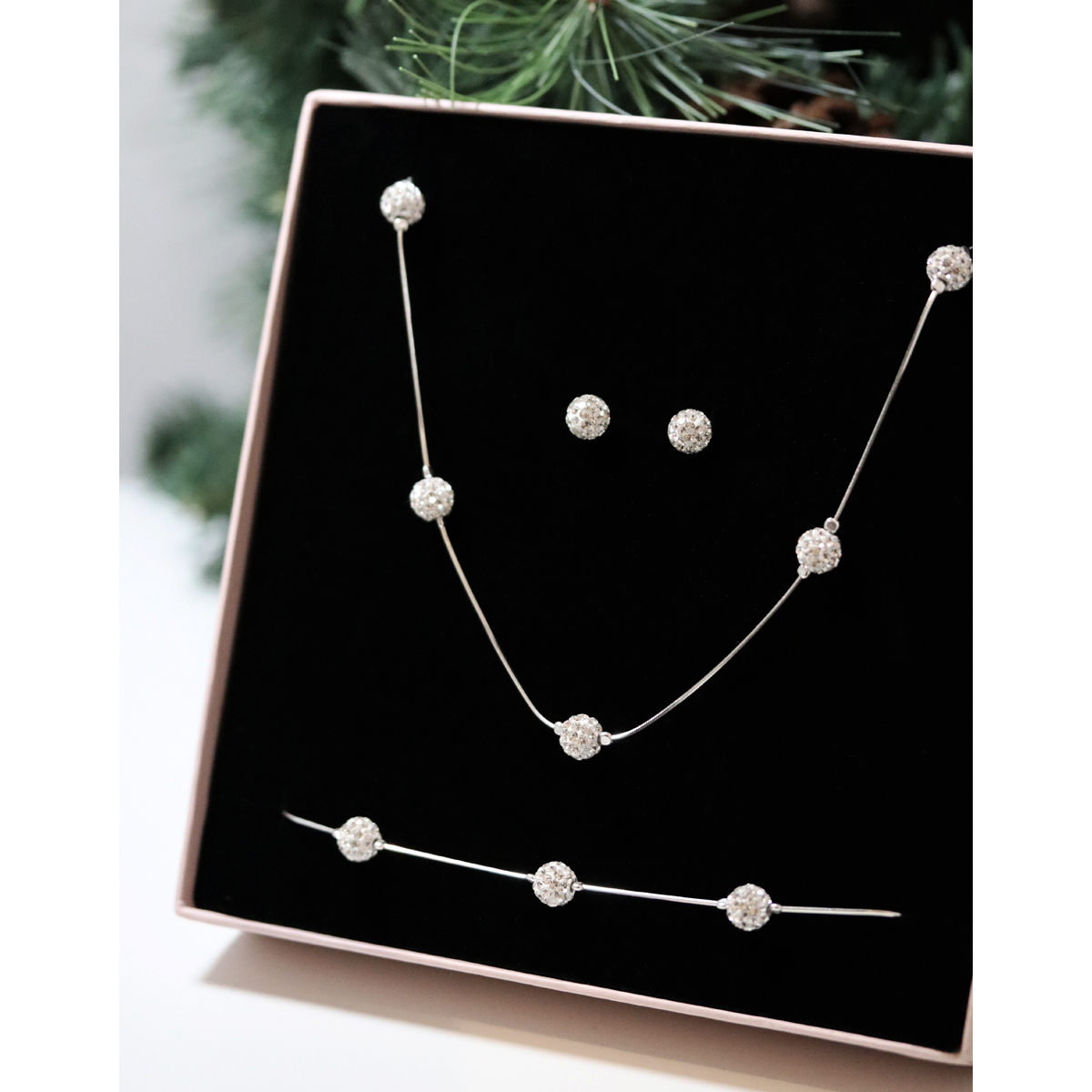 Komplet biżuterii srebrnej 925 – naszyjnik + bransoletka + kolczyki - błyszczące duże kulki shamballa discoball - pompilaż