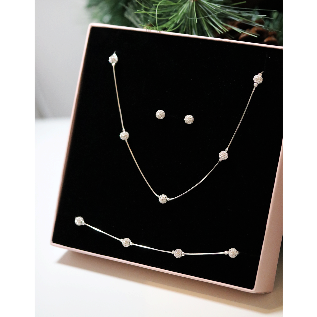 Komplet biżuterii srebrnej 925 – naszyjnik + bransoletka + kolczyki - błyszczące małe kulki shamballa discoball - pompilaż