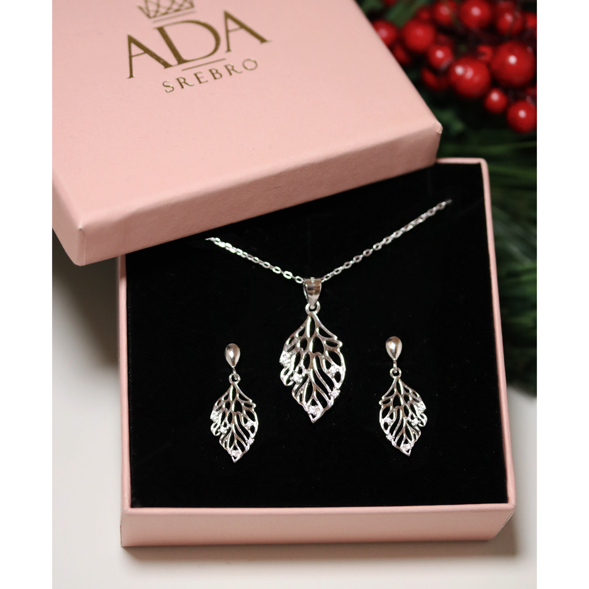 Komplet biżuterii przedstawiony na zdjęciu to elegancki zestaw składający się z kolii oraz kolczyków w kształcie liści. Ażurowe elementy mają delikatne wycięcia, które nadają im lekkości i finezji, a małe, błyszczące cyrkonie subtelnie podkreślają ich elegancki charakter.